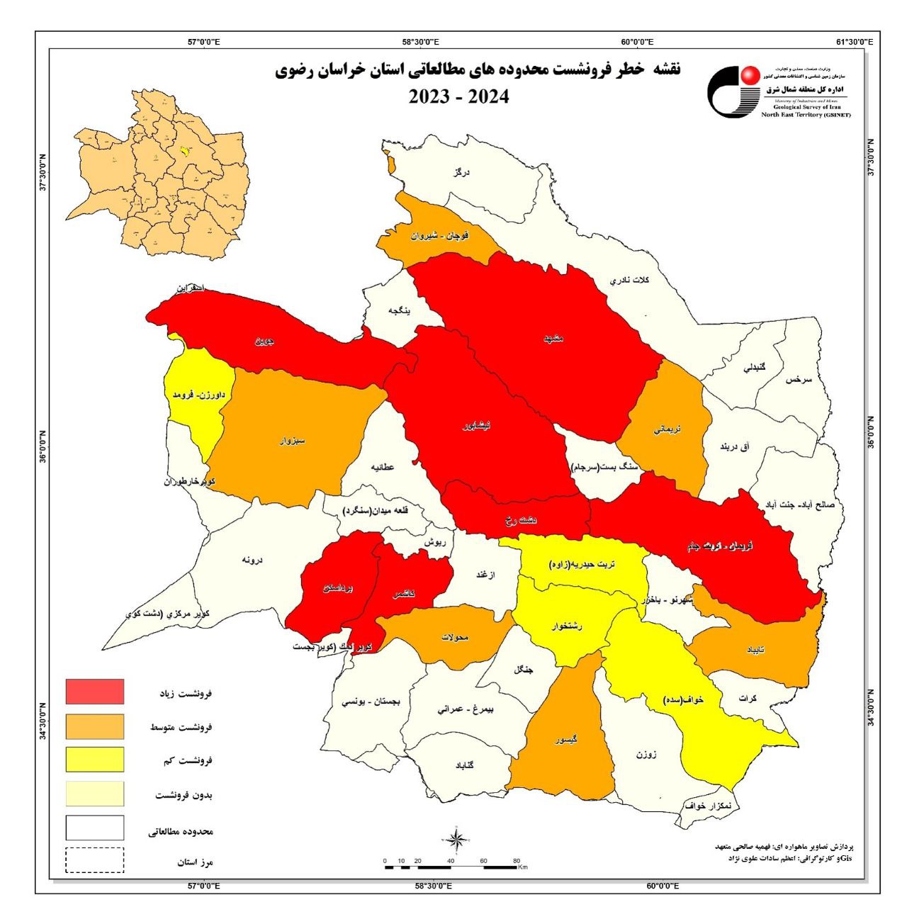 مدیرکل زمین‌شناسی منطقه شمال شرق با استناد به نقشه‌ احتمال خطر فرونشست زمین اظهار کرد: سازمان زمین‌شناسی در سالیان گذشته برای کل کشور در مقیاس یک دوم میلیونیم نقشه پیش بینی خطر فرونشست تهیه کرده، و استان خراسان رضوی یکی از استان‌هایی است که بیشترین احتمال خطر فرونشست در سطح زیاد تا بسیار زیاد برای آن پیش‌بینی شده و همان‌ پیش بینی ها در حال اتفاق است.